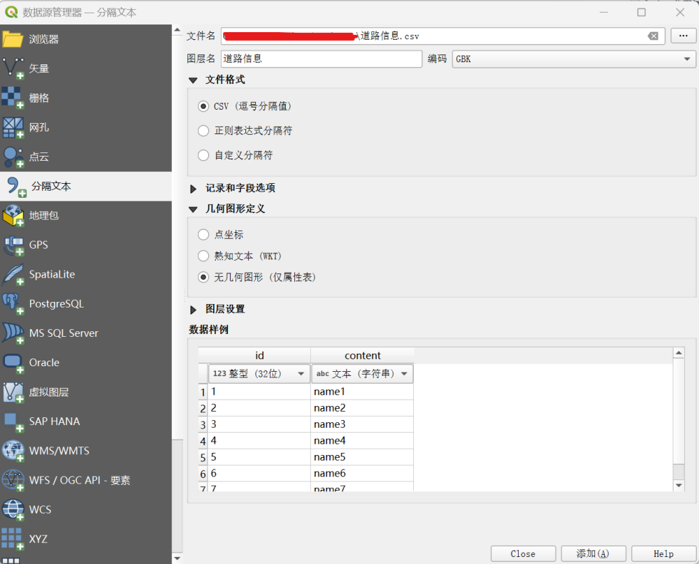 注意:由于目标是给矢量文件补充属性内容,无需显示坐标,所以在几何图形定义栏,选择无几何图形(仅属性表)。确认无误后,点击添加。