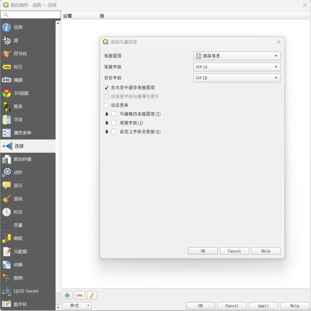 右键矢量图层,打开图层属性对话框。点击连接,再点击底部的加号按钮,添加新的连接。如下图所示。