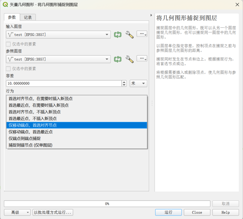 打开QGIS工具箱,双击将几何图形捕捉到图层工具。如下图所示。将输入图层和参考图层都设置为待处理的矢量线图层。
