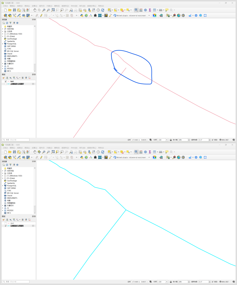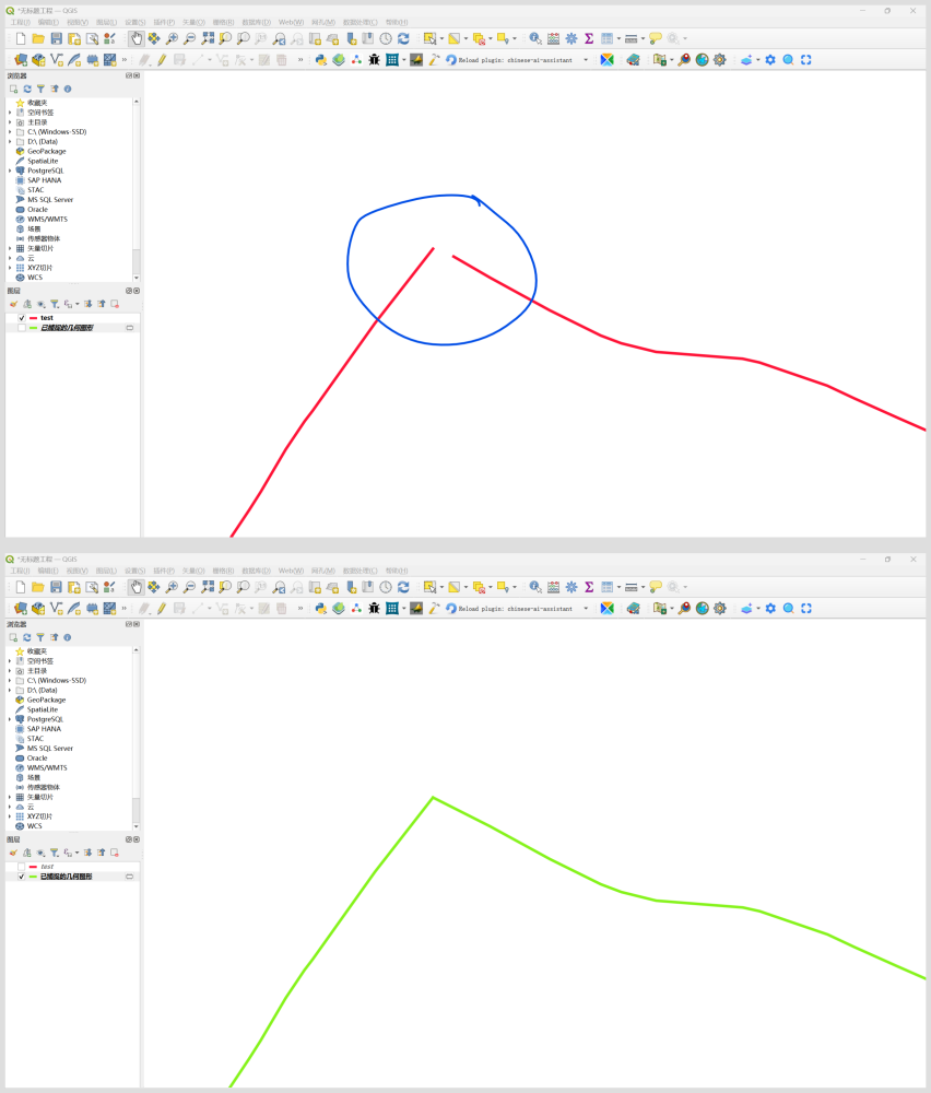 本文使用QGIS的将几何图形捕捉到图层工具,将悬挂点自动连接在一起。